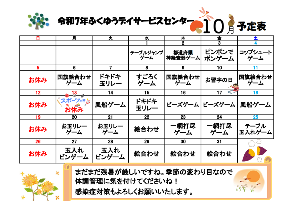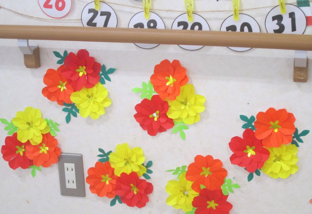 HOME > サービス付き高齢者向け住宅 福有えんじゅ > お知らせ お知らせlogin 前ヘ 1 2 3 4 5 6 7 8 9 10 11 次ヘ 行事予定・報告令和7年10月 作品紹介 少しずつ風が涼しくなり、秋の深まりを感じる季節となりました。今月も、フロアの壁面飾りを新しくしました。10月といえばハロウィンなので、カボチャモチーフです。シンプルな形ながら、温かみのある飾りになりました。そして、一般的に春から秋頃まで長期間楽しむことができるマリーゴールドのお花も作成しました。見ているだけでほっとするような空間になっています。 行事予定・報告令和7年10月 行事予定 行事予定・報告令和7年9月 作品紹介 今回は、「秋」がテーマです。季節の食べ物やお花を題材にしました。色とりどりの紙を使って果物の質感や色味を表現しています。あたたかみのある秋の風景となっております。 行事予定・報告令和7年9月 行事予定 行事予定・報告令和7年8月 作品紹介 まだまだ暑い日が続いていますが、いかがお過ごしでしょうか?当施設では、季節の移り変わりを感じていただけるよう、毎月、職員と利用者様で協力して壁面飾りを作成しています。まずはサルビアの切り絵です。初夏に力強く咲くサルビアの花が壁いっぱいに並び、小さなお花畑のようです。そしてもう1つのコーナーには、色とりどりの吊るし飾りが夏祭り気分を演出しています。これらの飾りは、季節を感じるだけでなく、手先を動かすリハビリや会話のきっかけづくりにも繋がっています。 行事予定・報告令和7年8月 行事予定 行事予定・報告令和7年7月 作品紹介 四国では6月27日に梅雨明けが発表され、平年より20日も早い記録的な夏の訪れとなりました。じめじめした季節が早々に過ぎ去り、連日の青空に心も晴れやかになりますね。今月の壁面飾りは、「竜宮城」をテーマに制作しました。型紙をくりぬき、カラフルな魚やカメ、乙姫さま、浦島太郎と勢ぞろい。壁画には、まるで海の中にいるような涼しげな風景が広がっています。お立ち寄りの際には、是非ご覧ください。 行事予定・報告令和7年7月 行事予定 行事予定・報告令和7年6月 作品紹介 今回の壁画は、梅雨モチーフです。雨の降る日が増えてきました。沖縄は既に梅雨入りしましたが、四国はまだ少し先のようです。柱には、カラフルな傘や雨粒が降る様子の折り紙が飾られ、彩りが添えられています。梅雨のしっとりとした雰囲気を、プラスに感じてもらえたら嬉しいです。 行事予定・報告令和7年6月 行事予定 前ヘ 1 2 3 4 5 6 7 8 9 10 11 次ヘ