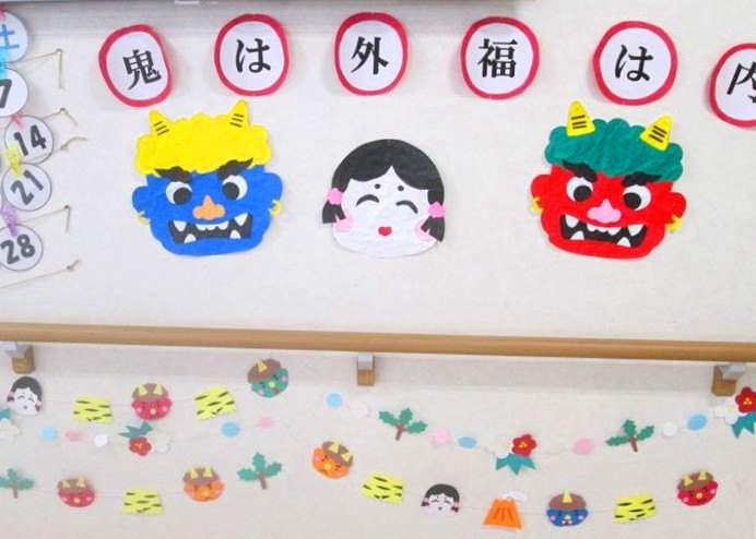 HOME > サービス付き高齢者向け住宅 福有えんじゅ > お知らせ お知らせlogin 前ヘ 1 2 3 4 5 6 7 8 9 10 11 12 次ヘ 行事予定・報告令和8年2月 作品紹介 2月といえば節分ですね。鬼やおたふくの壁紙を制作し、館内を彩っています。節分の鬼やおたふくには、昔から邪気を払い、福を招くという意味が込められているそうです。入居者様にも、「もう節分の時期だね」「かわいい鬼だね」といった声が聞かれました。 行事予定・報告令和8年2月 行事予定 行事予定・報告令和8年1月 作品紹介 新年あけましておめでとうございます。本年もどうぞよろしくお願いいたします。新しい年を迎えたため、書初めを行いました。皆さま筆を手に取ると、自然と表情が引き締まり、一文字一文字を丁寧に書かれていました。完成した作品は、施設内に飾らせていただいております。今年も入居者様が笑顔で安心して過ごしていただけるよう、職員一同努めてまいります。 行事予定・報告令和8年1月 行事予定 行事予定・報告令和7年12月 作品紹介 今月の作品は、サンタとトナカイの切り絵です。華やかなクリスマス仕様になりました。そしてフロアには、オーナメントいっぱいのクリスマスツリーを飾っています。冬の訪れとともに、ほっと心が和む空間になっておりますので、ご来訪の際は是非ご覧ください。 行事予定・報告令和7年12月 行事予定 行事予定・報告令和7年11月 作品紹介 朝晩の空気が冷え込んできましたが、まだ冬の厳しさまでは感じない穏やかな季節ですね。今月の作品紹介です。鮮やかな花々やきのこが、館内に季節の彩りを添えてくれています。手作りの飾りを通して、日々の暮らしにぬくもりを感じていただければ幸いです。 行事予定・報告令和7年11月 行事予定 行事予定・報告令和7年10月 作品紹介 少しずつ風が涼しくなり、秋の深まりを感じる季節となりました。今月も、フロアの壁面飾りを新しくしました。10月といえばハロウィンなので、カボチャモチーフです。シンプルな形ながら、温かみのある飾りになりました。そして、一般的に春から秋頃まで長期間楽しむことができるマリーゴールドのお花も作成しました。 行事予定・報告令和7年10月 行事予定 前ヘ 1 2 3 4 5 6 7 8 9 10 11 12 次ヘ