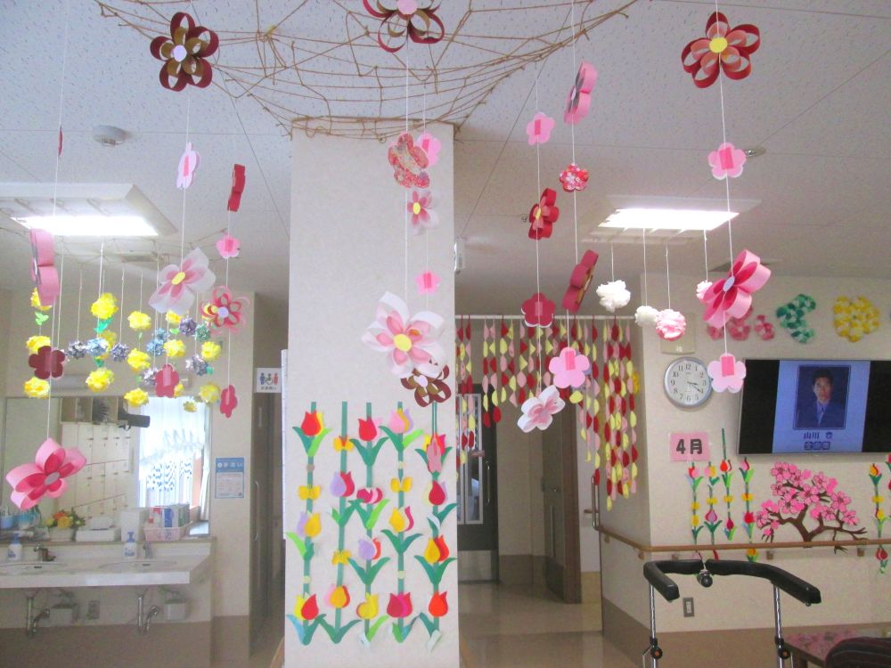 HOME > サービス付き高齢者向け住宅 福有えんじゅ > お知らせ お知らせ 医療法人悠穣会 芳川病院 行事予定・報告令和8年4月 作品紹介 少しずつ春の訪れを感じる季節となりました。まだ朝晩は肌寒い日もありますが、日中はやわらかな日差しを感じられるようになってきましたね。施設内でも春の訪れを感じていただけるよう、飾りつけを行いました。天井や壁には色とりどりのお花がたくさん飾られ、とても華やかな雰囲気になっています。ピンクや赤、黄色のお花が空間いっぱいに広がり、見上げるたびに春の気分を味わえます。「きれいだね」「春が来たね」といった声も聞かれ、皆さまの笑顔が見られました。